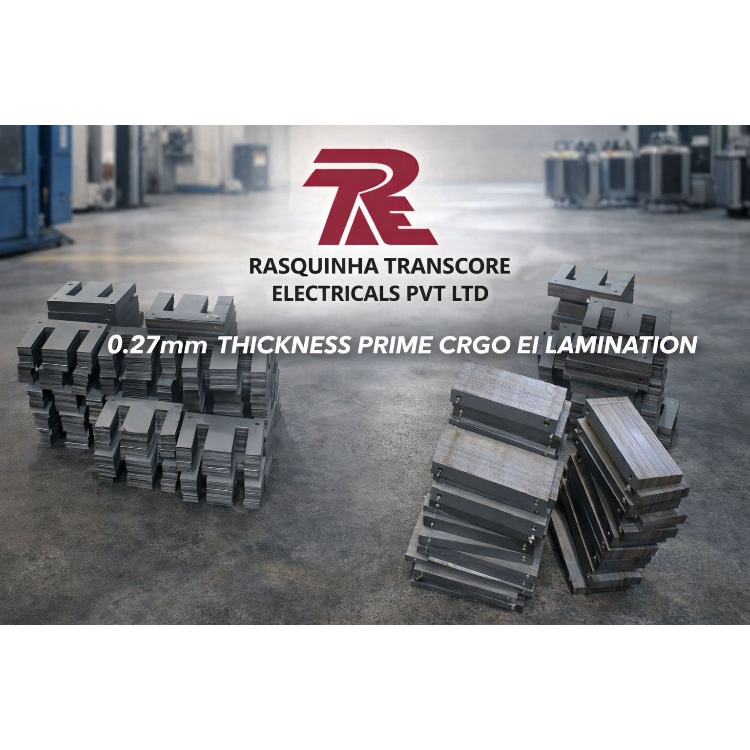 Premium 0.27mm Prime CRGO EI Laminations with low core loss and high efficiency. Manufactured by Rasquinha Transcore Electricals Pvt Ltd. Bulk supply available across India.