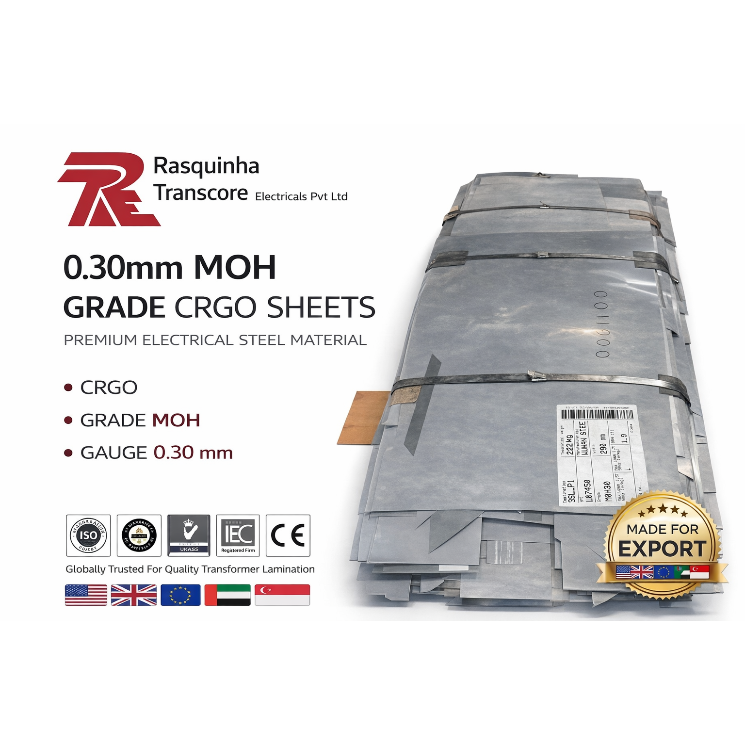 Premium 0.30mm MOH Grade CRGO electrical steel sheets for transformer lamination. Export quality, low core loss material. Ready stock in Mumbai. Global supply by Rasquinha Transcore Electricals Pvt Ltd.